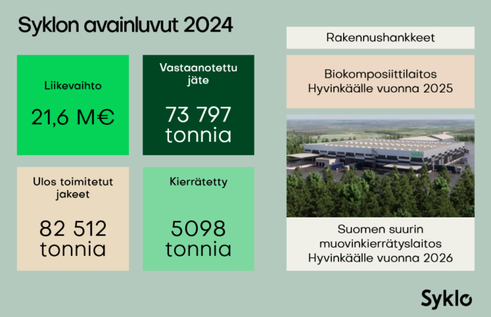 Tammikuun lopussa 2024 Syklo-konsernin tytäryhtiömme, muovinkierrätystä varten perustettu Syklo Terra Oy, osti edistykselliseen mekaaniseen muovinkierrätykseen keskittyneeltä Impact Recycling Ltd.:ltä (IR) teknologialisenssit, joiden avulla voimme rakentaa laitoksia ja myydä niiden tuotteita koko Euroopan laajuisesti. Tähän tiheyserojen hyödyntämiseen perustuvalla teknologialla on suunnitelmissamme rakentaa Hyvinkään kiertotalouskeskittymään Suomen suurin muovinkierrätyslaitos, joka kasvattaa suomalaista muovinkierrätyskapasiteettia jopa 50 prosenttia tarjoten markkinaan noin 50 000 tonnin vuosikapasiteetin. Tämän laitoksen edistämisen suhteen päätimme edetä vaiheittaisella liikkeellelähdöllä, jonka mukaisesti aloitimme laitoksen suunnittelutyöt ja maanrakennuksen vuoden 2024 lopulla. Saimme muovinkierrätyslaitoksen edellyttämän ympäristöluvan muutoksen 12.12.2024, ja teemme päätökset seuraavista askeleista alkuvuonna 2025.